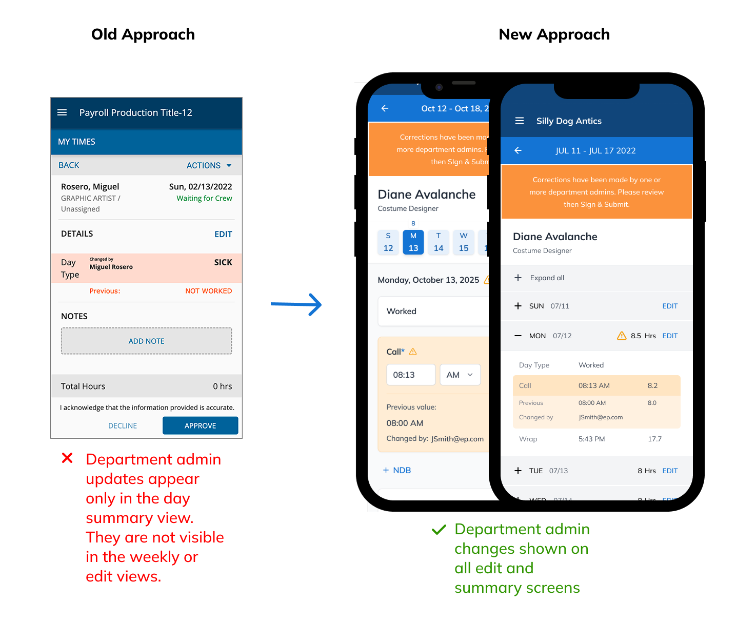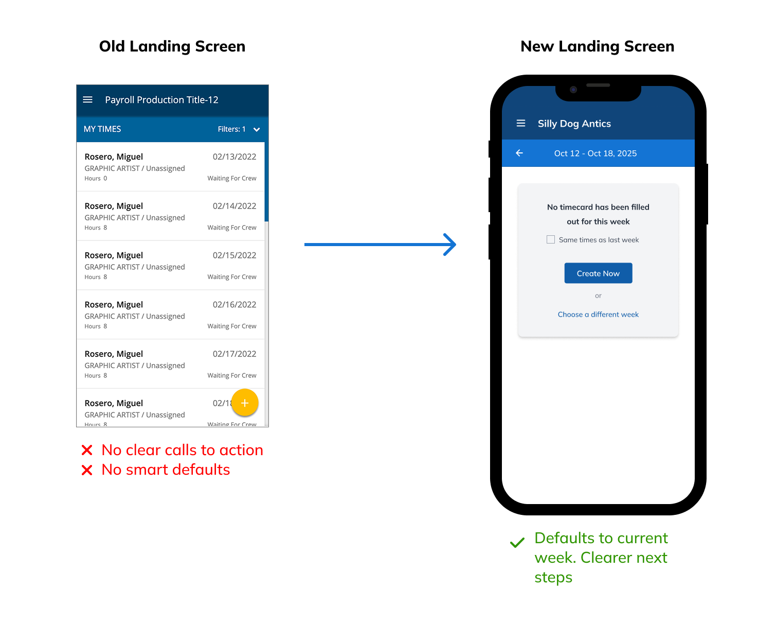 SmartTime Mobile was designed to offer crew members a digital way to fill out and submit timecards. However, after a rapid redesign that added admin features without any UX input, users struggled with major usability issues, and adoption stalled.